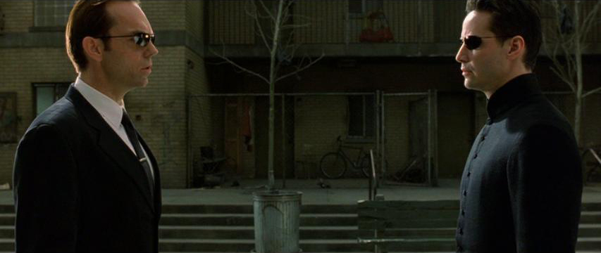 Agent Smith using an indirect approach, predicting the location to where Neo is fleeing rather than following him. (Scene: Chase to Room 303)